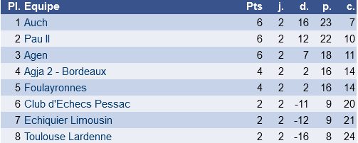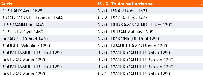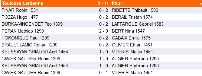 L’équipe 2, sérieusement diminuée - un grand nombre de joueurs étant indisponibles pour cette journée - n’a pas pu tenir contre une équipe de Pau bien mieux classée et s’est inclinée par 11 à 5. Mention spéciale à Axel Keussayan qui remporte ses deux parties !