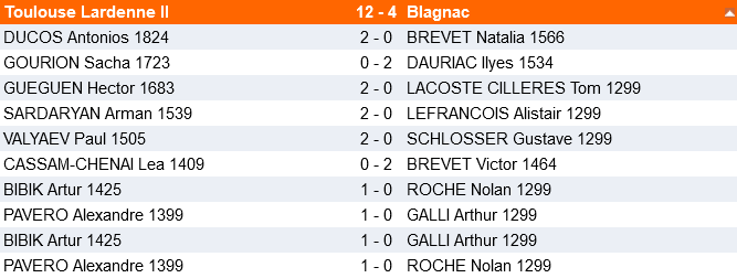 Sur le plan sportif, notre équipe première fait le job contre Blagnac avec une victoire assez nette par 12 à 4. Petite déception pour Sacha qui se fait surprendre malgré deux pions de plus, mais une position ressérée.