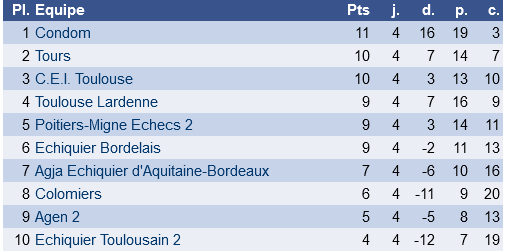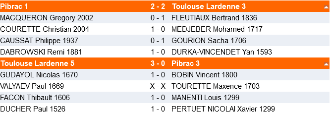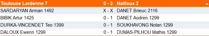 Du bon et du moins bon pour nos formations de Championnat départemental par équipes de 4. Très belle performance d’Arman Sardaryan qui annule un joueur à plus de 2100 ! Mauvaise nouvelle pour le club par contre pour le club qui a été contraint de déclarer le forfait de Lardenne 8, faut de combattants. Il n’est pas toujours simple de former des équipes pour une association qui en compte pas moins de 8 ( sans compter les équipes jeunes et féminines)