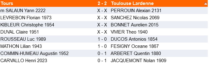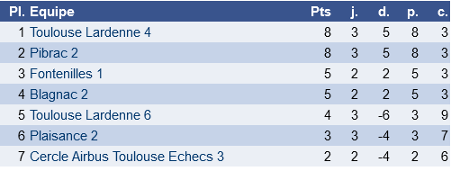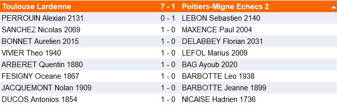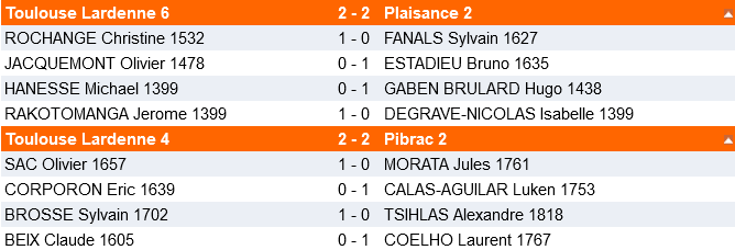 Match important pour la formation de Lardenne et finalement bien négocié malgré la force des deux premiers échiquiers des adversaires ( 2 joueurs 2100 aux deux premiers échiquiers, en nationale IV, ce n’est pas si fréquent ! ) Bravo à cette équipe pour laquelle tout est encore possible !
