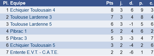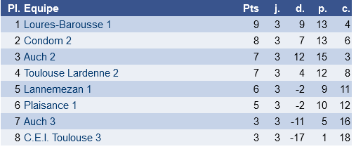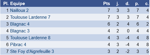 Ca passe également pour Toulouse Lardenne 5 qui l’emporte et reste en embuscade. Dans l’autre groupe, Toulouse Lardenne tient bon et conserve la tête du groupe, tout est encore possible pour cette formation qui aura des matchs importants à jouer très prochainement.