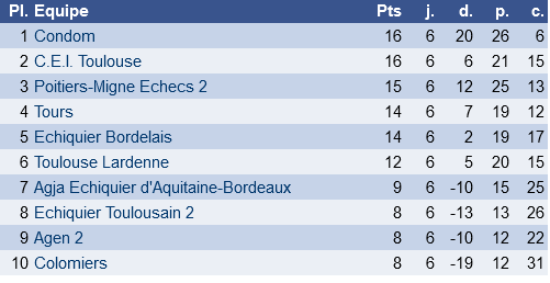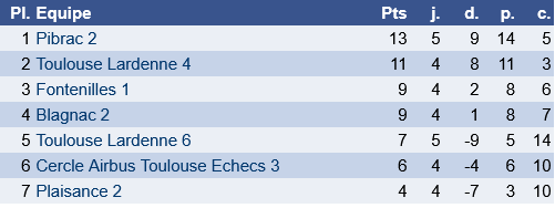 L’équipe de Lardenne 1 avait à jouer un match compliqué après son très bon match nul du 19 janvier contre les leaders Condom. Après avoir mené 2 à 0 puis deux nulles solides, l’équipe résiste mal à la pression sur des positions difficiles mais tenables et s’incline finalement par 4 à 2 et se retrouve en milieu de tableau.