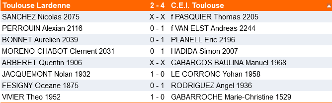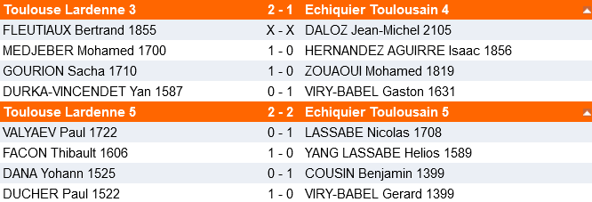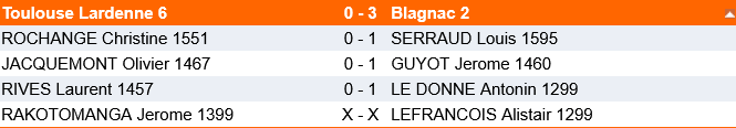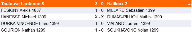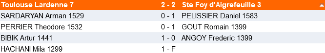 En ligue 1, Lardenne 3 fait un gros match contre l’ET4 sérieusement renforcé pour l’occasion et conserve encore quelques chances avec une courte victoire par 2 à 1. Mention spéciale pour Bertrand Fleutiaux qui annule un + 2100. Bonnes perfs également pour Sacha et Mohamed.
