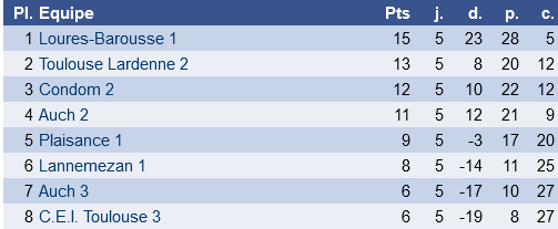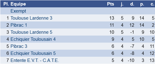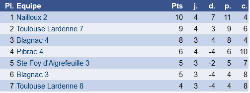 Dans l’autre groupe de ligue 1, l’équipe Lardenne 4 était exempte et conserve la seconde place du groupe, mais avec un match en moins. Cette équipe a son avenir entre ses mains puisque il lui suffit de gagner ses deux derniers matchs pour terminer première du groupe.