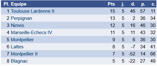 La N2 jeunes, avec les rondes 4 et 5 du groupe XII (4 équipes avec Toulouse Lardenne II et Blagnac Echecs).
