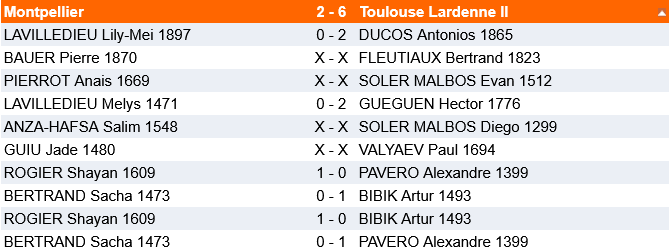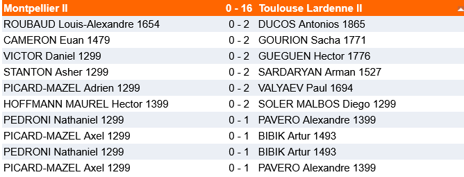 Un grand match pour notre formation contre une équipe de Montpellier I renforcée, mais qui avait raté son dernier week-end d’interclubs jeunes. La rencontre a longtemps été incertaine et pouvait basculer dans un sens comme dans l’autre. Artur gagne assez vite sa première partie tandis qu’Alexandre se fait surprendre, Hector confirme également peu après, et nous voilà à mener 3 à 1. Le score va rester un grand moment inchangé avec les bonnes nulles d’Evan et de Diego Soler-Malbos. Peu après, Paul, plutôt en difficulté parvient également à neutraliser, toujours 3 à 1 avec les deuxièmes parties d’Alexandre et d’Artur à jouer, mais Bertrand est mal tandis que la partie d’Antonios est très incertaine. Alexandre concrétise peu après, 4 à 1 pour nous. Artur lance une attaque de mat mais se trompe dans sa réalisation, ça part pour 4 à 4 car Bertrand a deux pions de moins mais un peu de contre-jeu. Finalement la décision viendra d’Antonios qui prend un avantage décisif dans le zeitnot réciproque, 6 à 1 donc et score final 6 à 2 (Bertrand parvient à sauver sa position tandis qu’Artur doit s’incliner). Bravo à l’équipe !