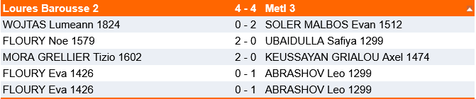 Impressionnante équipe de Lardenne 3 menée par Arman, Evan, Safiya , Axel et Léo qui tient bon et conserve la tête du groupe lors de cette deuxième journée d’interclubs jeunes de nationale III. L’équipe assure deux victoires sans bavure contre deux équipes de niveau très correct et réalise un très bon match nul contre une équipe de Loure-Barousse pourtant bien mieux classée sur le papier ! Mention spéciale à Evan qui fait la perf du jour avec une victoire avec les noirs contre un +1800 !