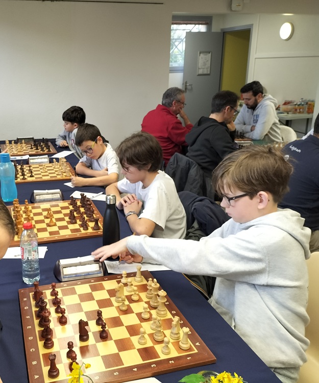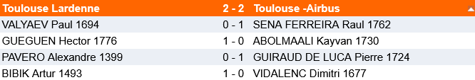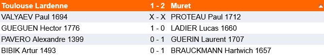 Cette équipe, composée de Paul, Hector, Alexandre et Artur s’est très bien battue, accrochant l’équipe du CATE à la première ronde et l’emportant même de justesse à la seconde ronde. La fatigue s’est malheureusement fait sentir lors de la troisième ronde - où il fallait gagner pour se qualifier - pour Alexandre, notamment, qui avec une très bonne position donne un pion gratuitement et finit par céder le point. Hector et Paul limitent la casse mais au final c’est une courte défaite qui marque un coup d’arrêt pour cette équipe dans la poursuite de la compétition. C’est cependant une très bonne expérience pour nos jeunes qui ont beaucoup appris !