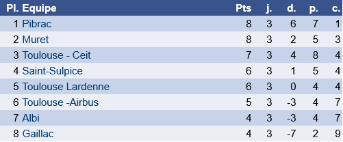 Pibrac et Muret terminent en tête avec 8 points et sont qualifiées pour la troisième phase.
