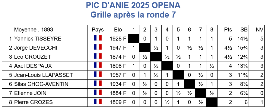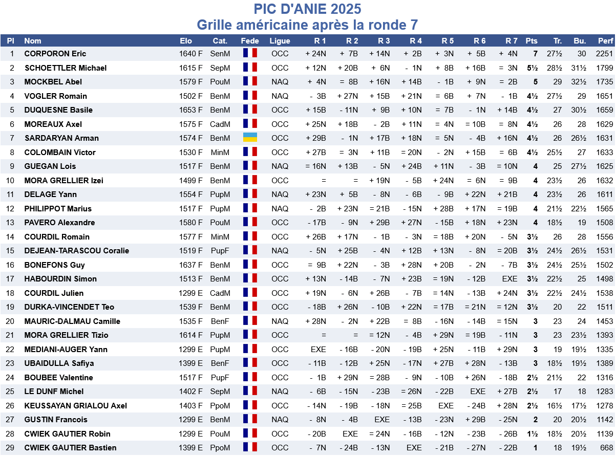 Dans l’open C, c’est assez moyen pour les jeunes de Lardenne excepté Arman Sardaryan et Victor Colombain qui font des résultats très corrects. On notera également la très belle victoire de notre membre Eric Corporon avec le score parfait de 7/7.