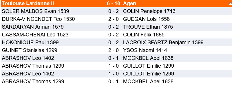 Le premier match contre Agen semblait assez déséquilibré (en notre défaveur) mais grâce à une très bonne combativité de nos troupes, il aurait pu basculer à notre avantage. Paul Hokonique avait une bonne finale avec un pion net de plus avant une gaffe monumentale, Arman était complètement gagnant, mais sa position d’est écroulée sur un coup joué un peu rapidement. Dommage ! Bon résultat en revanche pour Téo qui s’est très bien défendu tactiquement ainsi que pour Stanislas qui domine son adversaire avec son ouverture bien menée !