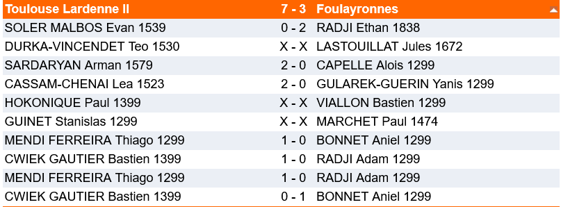 Le second match nous opposait à Foulayronnes et , pour tenter le maintien, il nous fallait faire quelque chose. Ca a plutôt bien commencé en U10 avec les victoires rapides de Thiago et Bastien, mais en U12 ça a un peu patiné, notamment avec la partie de Stan qui n’arrive pas à concrétiser avec deux pions de plus. En revanche tout allait bien fonctionner en U14 avec la concrétitsation d’Arman et de Léa. En U16 Evan et Téo sont en grande difficulté, mais Téo , avec une pièce de moins en finale, parvient à valoriser ses pions centraux et se retrouve en net avantage, cela finira malgré tout par le partage du point.